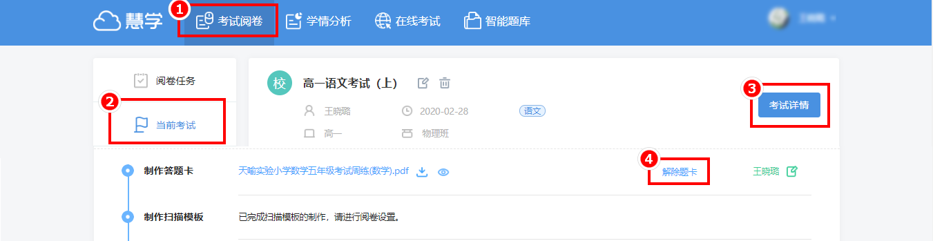 操作方法:在“考试阅卷”—“当前考试”—“考试详情”页面点击“解除题卡”后,将纸质答题卡放入扫描仪,启动电脑扫描仪客户端扫描该纸质答题卡,然后制作扫描模板
