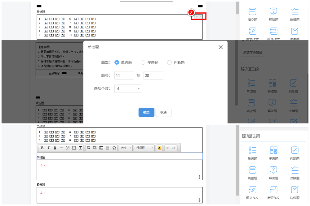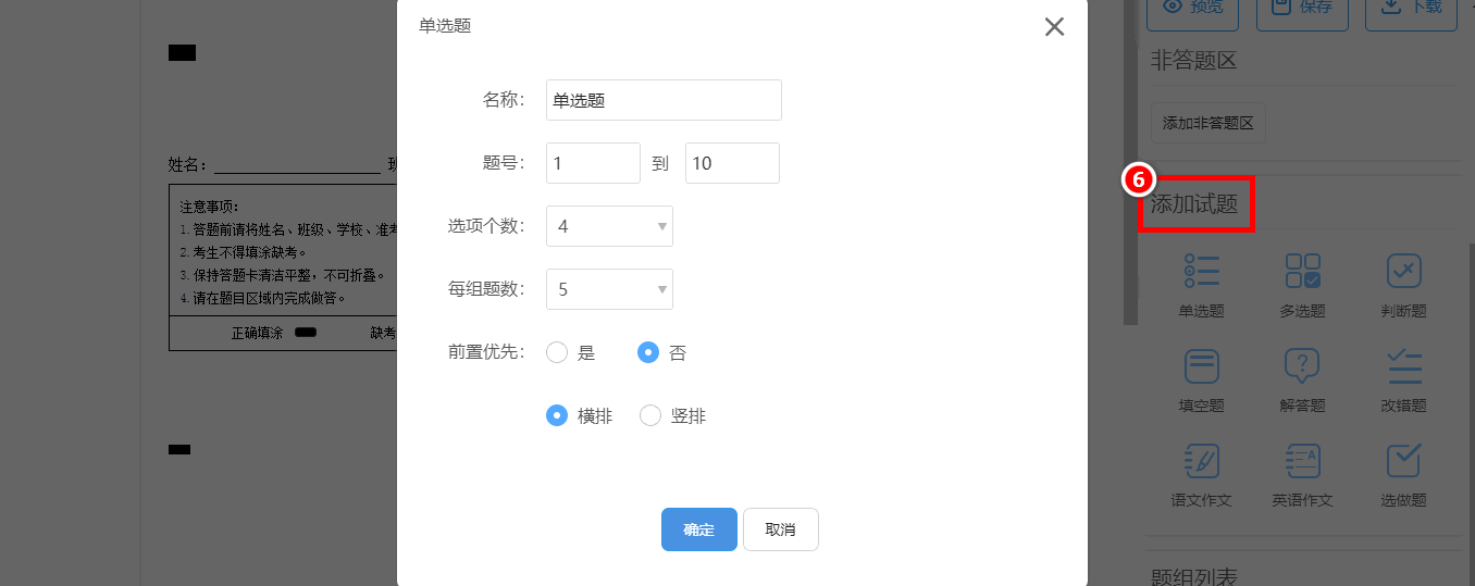 第三步:在“添加试题”的模块,有多种试题题型可供选择。点击“单选题” ,名称可编辑。录入起始与终止题号,选项的个数,分值等信息,选择是否置顶,横排或竖排,点击[确定]即可生成。多选题的设置也是一样的操作。