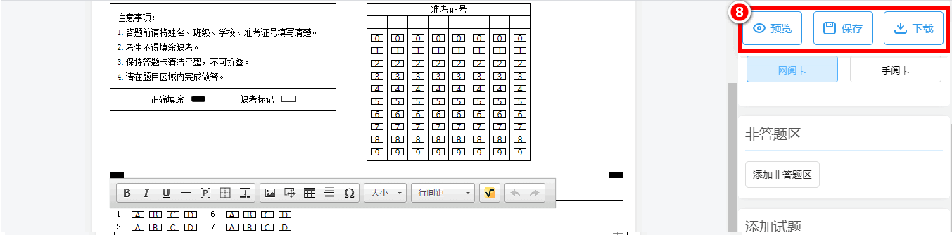 第五步:答题卡制作过程中,可以点击右侧工具栏的“保存”先进行暂存。最终制作好后,点击“预览”,可预览设计好的答题卡效果,确认无误之后点击“下载”即可导出制作好的答题卡。