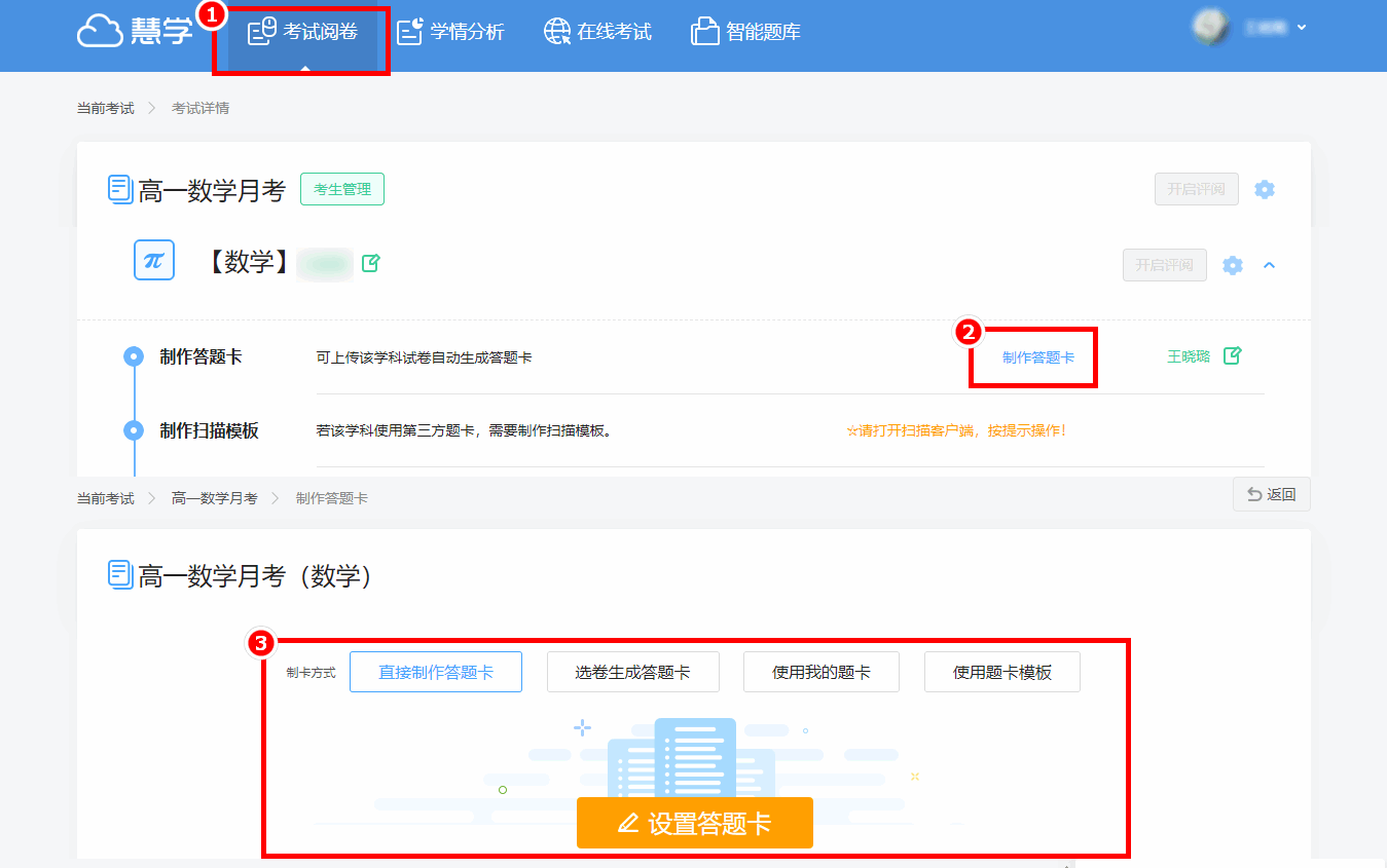 第一步:登录慧学系统:exam.tyhuixue.com,在“考试阅卷”界面,点击“制作答题卡”,支持四种制卡方式:直接制作答题卡、选卷生成答题卡、使用我的题卡和使用题卡模板。这里以“直接制作答题卡”为例做详细介绍,其他方式操作类似。